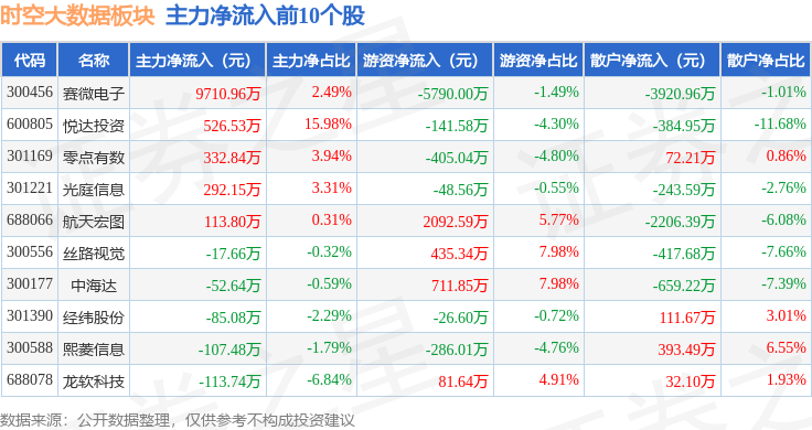 从资金流向上来看,当日时空大数据板块主力资金净流出8.01亿元,游资资金净流入2.56亿元,散户资金净流入5.45亿元。时空大数据板块个股资金流向见下表: