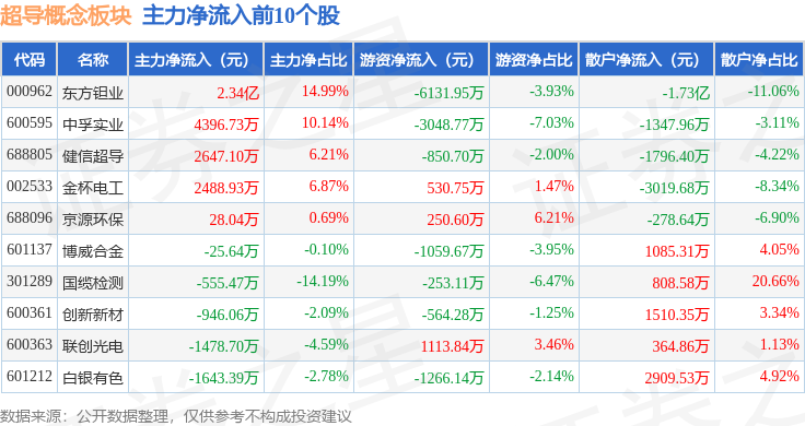 从资金流向上来看,当日超导概念板块主力资金净流出12.81亿元,游资资金净流入2.83亿元,散户资金净流入9.98亿元。超导概念板块个股资金流向见下表: