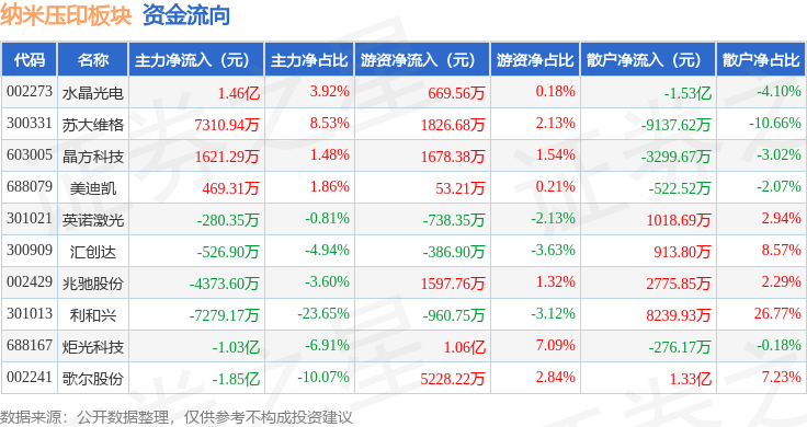 从资金流向上来看,当日纳米压印板块主力资金净流出1.73亿元,游资资金净流入1.96亿元,散户资金净流出2248.5万元。纳米压印板块个股资金流向见下表: