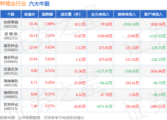 个股表现方面,种植业行业当日领涨股为宏辉果蔬(603336),该股当日报收10.3,上涨3.0%,成交量18.11万,主力资金净流入79.58万元。诺 普 信(002215)以上涨2.22%紧随其后,该股当日成交量15.87万,主力资金净流入1100.09万元。除此之外,康农种业(920403)、康农种业(920403)、苏垦农发(601952)均进入当日牛股之列。具体个股列表见下表: