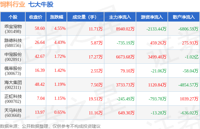 个股表现方面,饲料行业当日领涨股为乖宝宠物(301498),该股当日报收58.6,上涨4.55%,成交量11.71万,主力资金净流入8940.02万元。路德科技(688156)以上涨4.43%紧随其后,该股当日成交量5.87万,主力资金净流出735.19万元。除此之外,中宠股份(002891)、佩蒂股份(300673)、海大集团(002311)均进入当日牛股之列。具体个股列表见下表: