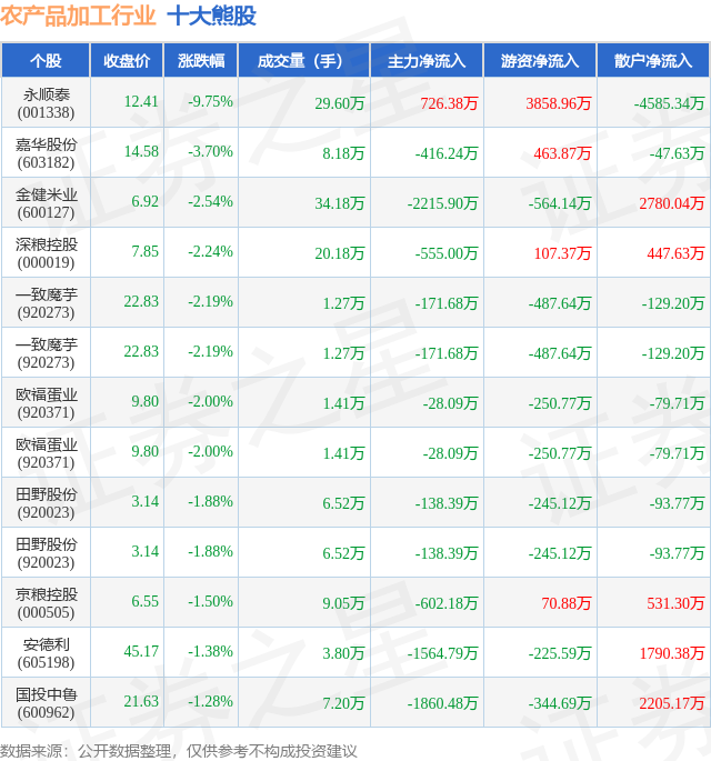 个股表现方面,农产品加工行业当日领跌股为永顺泰(001338),该股当日报收12.41,下跌9.75%,成交量29.6万,主力资金净流入726.38万元。嘉华股份(603182)以下跌3.7%紧随其后,该股当日成交量8.18万,主力资金净流出416.24万元。除此之外,金健米业(600127)、深粮控股(000019)、一致魔芋(920273)均进入当日熊股之列。具体个股列表见下表: