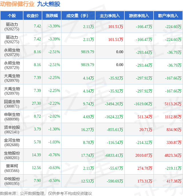 个股表现方面,动物保健行业当日领跌股为驱动力(920275),该股当日报收7.42,下跌3.39%,成交量2.11万,主力资金净流入101.51万元。驱动力(920275)以下跌3.39%紧随其后,该股当日成交量2.11万,主力资金净流入101.51万元。除此之外,永顺生物(920729)、永顺生物(920729)、大禹生物(920970)均进入当日熊股之列。具体个股列表见下表: