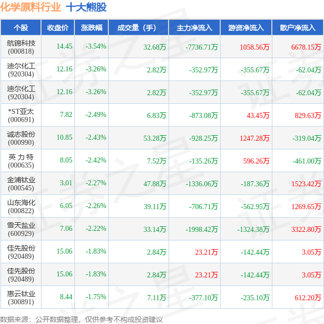 个股表现方面,化学原料行业当日领跌股为航锦科技(000818),该股当日报收14.45,下跌3.54%,成交量32.68万,主力资金净流出7736.71万元。迪尔化工(920304)以下跌3.26%紧随其后,该股当日成交量2.82万,主力资金净流出352.97万元。除此之外,迪尔化工(920304)、*ST亚太(000691)、诚志股份(000990)均进入当日熊股之列。具体个股列表见下表: