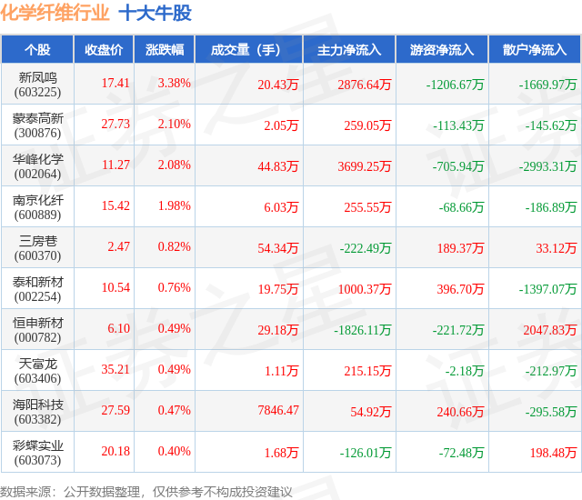 个股表现方面,化学纤维行业当日领涨股为新凤鸣(603225),该股当日报收17.41,上涨3.38%,成交量20.43万,主力资金净流入2876.64万元。蒙泰高新(300876)以上涨2.1%紧随其后,该股当日成交量2.05万,主力资金净流入259.05万元。除此之外,华峰化学(002064)、南京化纤(600889)、三房巷(600370)均进入当日牛股之列。具体个股列表见下表: