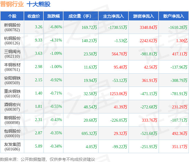 个股表现方面,普钢行业当日领跌股为新钢股份(600782),该股当日报收3.26,下跌6.86%,成交量169.72万,主力资金净流出1730.55万元。杭钢股份(600126)以下跌4.31%紧随其后,该股当日成交量140.23万,主力资金净流出1.53亿元。除此之外,三钢闽光(002110)、本钢板材(000761)、安阳钢铁(600569)均进入当日熊股之列。具体个股列表见下表: