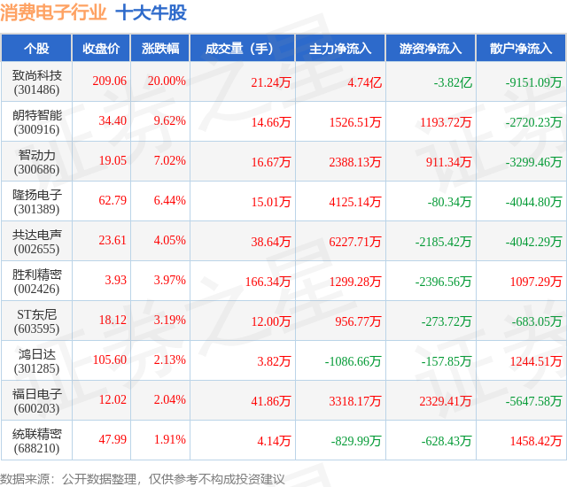 个股表现方面,消费电子行业当日领涨股为致尚科技(301486),该股当日报收209.06,上涨20.0%,成交量21.24万,主力资金净流入4.74亿元。朗特智能(300916)以上涨9.62%紧随其后,该股当日成交量14.66万,主力资金净流入1526.51万元。除此之外,智动力(300686)、隆扬电子(301389)、共达电声(002655)均进入当日牛股之列。具体个股列表见下表: