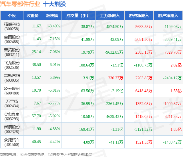 个股表现方面,汽车零部件行业当日领跌股为精锻科技(300258),该股当日报收11.67,下跌8.4%,成交量38.87万,主力资金净流出4574.5万元。金固股份(002488)以下跌7.15%紧随其后,该股当日成交量41.99万,主力资金净流出42.09万元。除此之外,晋拓股份(603211)、飞龙股份(002536)、常熟汽饰(603035)均进入当日熊股之列。具体个股列表见下表: