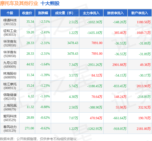 个股表现方面,摩托车及其他行业当日领跌股为绿通科技(301322),该股当日报收35.34,下跌2.51%,成交量2.51万,主力资金净流出1032.3万元。征和工业(003033)以下跌2.41%紧随其后,该股当日成交量1.22万,主力资金净流出1435.18万元。除此之外,华洋赛车(920058)、华洋赛车(920058)、九号公司(689009)均进入当日熊股之列。具体个股列表见下表: