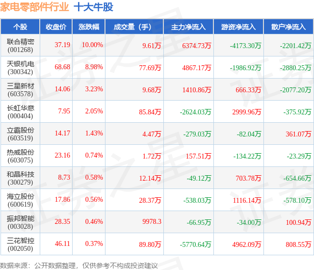 个股表现方面,家电零部件行业当日领涨股为联合精密(001268),该股当日报收37.19,上涨10.0%,成交量9.61万,主力资金净流入6374.73万元。天银机电(300342)以上涨8.98%紧随其后,该股当日成交量77.69万,主力资金净流入4867.17万元。除此之外,三星新材(603578)、长虹华意(000404)、立霸股份(603519)均进入当日牛股之列。具体个股列表见下表: