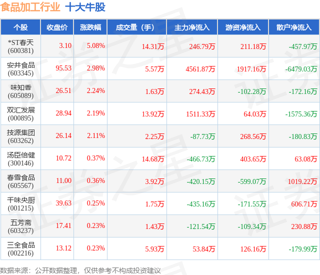 个股表现方面,食品加工行业当日领涨股为*ST春天(600381),该股当日报收3.1,上涨5.08%,成交量14.31万,主力资金净流入246.79万元。安井食品(603345)以上涨2.98%紧随其后,该股当日成交量5.57万,主力资金净流入4561.87万元。除此之外,味知香(605089)、双汇发展(000895)、技源集团(603262)均进入当日牛股之列。具体个股列表见下表: