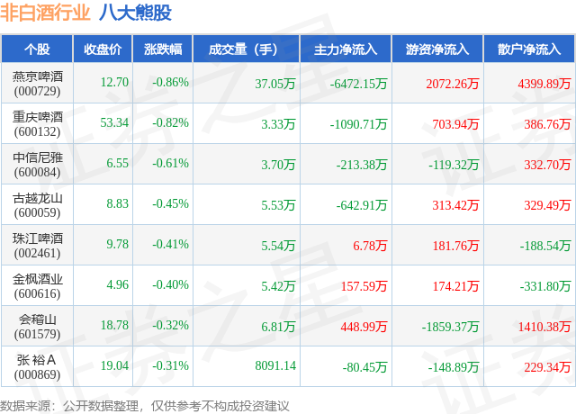 个股表现方面,非白酒行业当日领跌股为燕京啤酒(000729),该股当日报收12.7,下跌0.86%,成交量37.05万,主力资金净流出6472.15万元。重庆啤酒(600132)以下跌0.82%紧随其后,该股当日成交量3.33万,主力资金净流出1090.71万元。除此之外,中信尼雅(600084)、古越龙山(600059)、珠江啤酒(002461)均进入当日熊股之列。具体个股列表见下表: