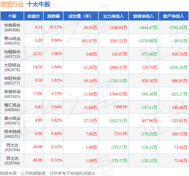 个股表现方面,造纸行业当日领涨股为华泰股份(600308),该股当日报收4.14,上涨10.11%,成交量49.01万,主力资金净流入5146.89万元。青山纸业(600103)以上涨9.94%紧随其后,该股当日成交量402.87万,主力资金净流入3581.52万元。除此之外,仙鹤股份(603733)、太阳纸业(002078)、华旺科技(605377)均进入当日牛股之列。具体个股列表见下表: