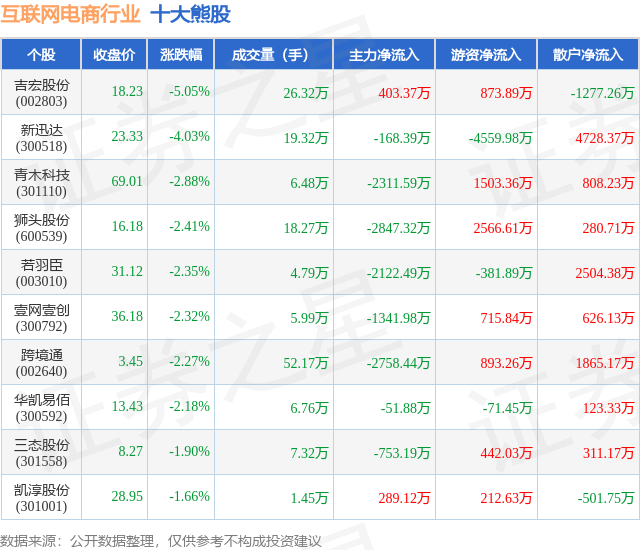 个股表现方面,互联网电商行业当日领跌股为吉宏股份(002803),该股当日报收18.23,下跌5.05%,成交量26.32万,主力资金净流入403.37万元。新迅达(300518)以下跌4.03%紧随其后,该股当日成交量19.32万,主力资金净流出168.39万元。除此之外,青木科技(301110)、狮头股份(600539)、若羽臣(003010)均进入当日熊股之列。具体个股列表见下表: