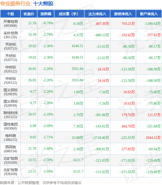 个股表现方面,专业服务行业当日领跌股为开普检测(003008),该股当日报收21.59,下跌8.79%,成交量8.18万,主力资金净流入407.39万元。实朴检测(301228)以下跌2.79%紧随其后,该股当日成交量4.31万,主力资金净流出480.23万元。除此之外,天纺标(920753)、天纺标(920753)、中纺标(920122)均进入当日熊股之列。具体个股列表见下表: