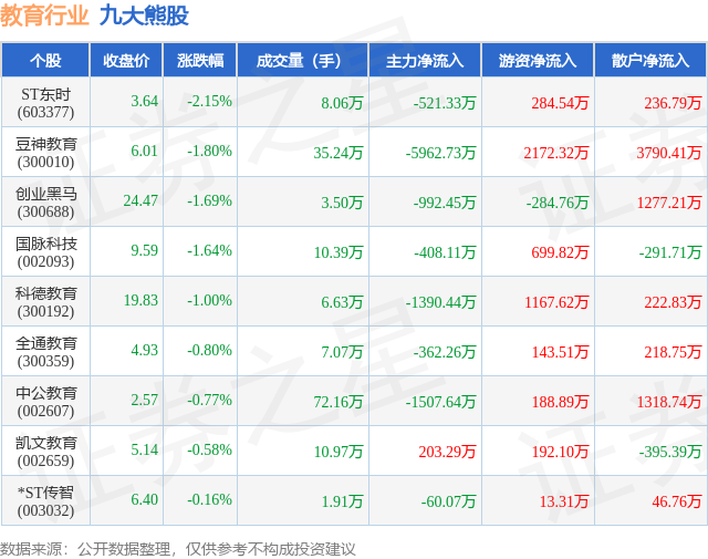 个股表现方面,教育行业当日领跌股为ST东时(603377),该股当日报收3.64,下跌2.15%,成交量8.06万,主力资金净流出521.33万元。豆神教育(300010)以下跌1.8%紧随其后,该股当日成交量35.24万,主力资金净流出5962.73万元。除此之外,创业黑马(300688)、国脉科技(002093)、科德教育(300192)均进入当日熊股之列。具体个股列表见下表:
