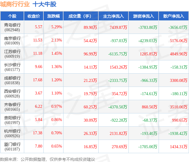 个股表现方面,城商行行业当日领涨股为青岛银行(002948),该股当日报收5.57,上涨5.29%,成交量89.9万,主力资金净流入7439.87万元。南京银行(601009)以上涨2.13%紧随其后,该股当日成交量54.42万,主力资金净流出937.03万元。除此之外,江苏银行(600919)、长沙银行(601577)、成都银行(601838)均进入当日牛股之列。具体个股列表见下表: