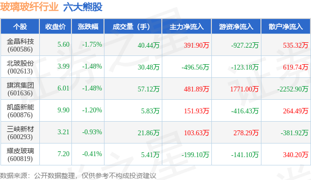 个股表现方面,玻璃玻纤行业当日领跌股为金晶科技(600586),该股当日报收5.6,下跌1.75%,成交量40.44万,主力资金净流入391.9万元。北玻股份(002613)以下跌1.48%紧随其后,该股当日成交量30.48万,主力资金净流出496.56万元。除此之外,旗滨集团(601636)、凯盛新能(600876)、三峡新材(600293)均进入当日熊股之列。具体个股列表见下表: