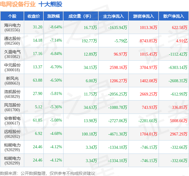 个股表现方面,电网设备行业当日领跌股为海兴电力(603556),该股当日报收31.2,下跌8.64%,成交量16.73万,主力资金净流出1635.94万元。通达股份(002560)以下跌7.14%紧随其后,该股当日成交量192.77万,主力资金净流出5.79亿元。除此之外,久盛电气(301082)、中元股份(300018)、新风光(688663)均进入当日熊股之列。具体个股列表见下表: