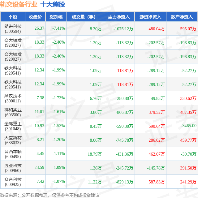 个股表现方面,轨交设备行业当日领跌股为朗进科技(300594),该股当日报收26.37,下跌7.41%,成交量8.3万,主力资金净流出1075.12万元。交大铁发(920027)以下跌2.4%紧随其后,该股当日成交量1.2万,主力资金净流出113.32万元。除此之外,交大铁发(920027)、铁大科技(920541)、铁大科技(920541)均进入当日熊股之列。具体个股列表见下表: