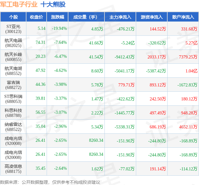 个股表现方面,军工电子行业当日领跌股为ST亚光(300123),该股当日报收5.14,下跌19.94%,成交量4.85万,主力资金净流出476.21万元。航天电器(002025)以下跌7.64%紧随其后,该股当日成交量41.66万,主力资金净流出5.24亿元。除此之外,航天长峰(600855)、航天南湖(688552)、富吉瑞(688272)均进入当日熊股之列。具体个股列表见下表: