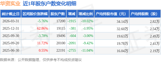 从股价来看,2025年12月31日至2026年3月31日,华资实业区间跌幅为5.76%,在此期间股东户数减少1915.0户,减幅为10.02%。