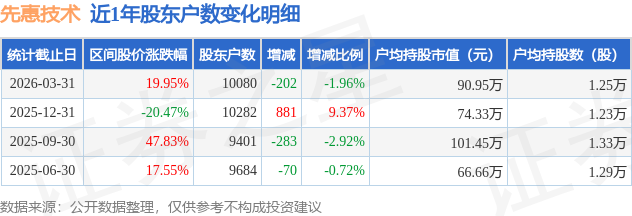 从股价来看,2025年12月31日至2026年3月31日,先惠技术区间涨幅为19.95%,在此期间股东户数减少202.0户,减幅为1.96%。