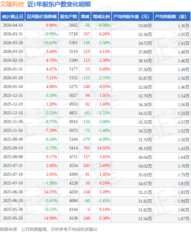 从股价来看,2026年3月31日至2026年4月10日,艾隆科技区间涨幅为0.96%,在此期间股东户数减少56.0户,减幅为0.98%。