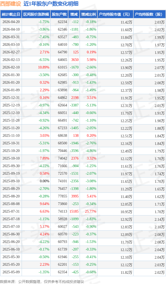 从股价来看,2026年4月10日至2026年4月20日,西部建设区间跌幅为1.75%,在此期间股东户数减少112.0户,减幅为0.18%。