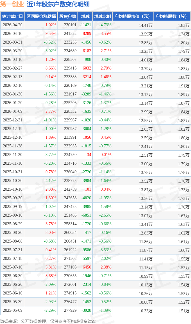 从股价来看,2026年4月10日至2026年4月20日,第一创业区间涨幅为1.02%,在此期间股东户数减少1.14万户,减幅为4.73%。