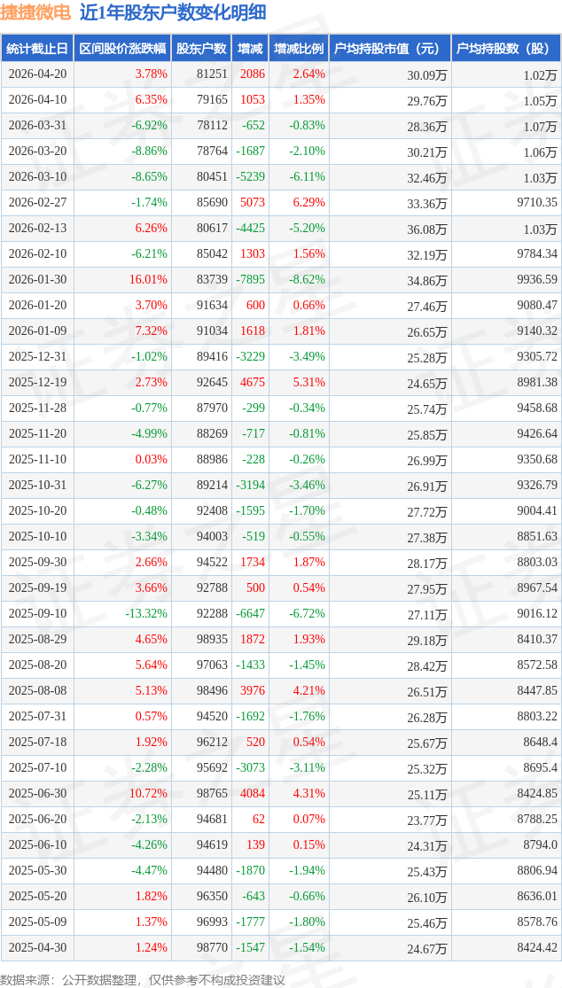从股价来看,2026年4月10日至2026年4月20日,捷捷微电区间涨幅为3.78%,在此期间股东户数增加2086.0户,增幅为2.64%。