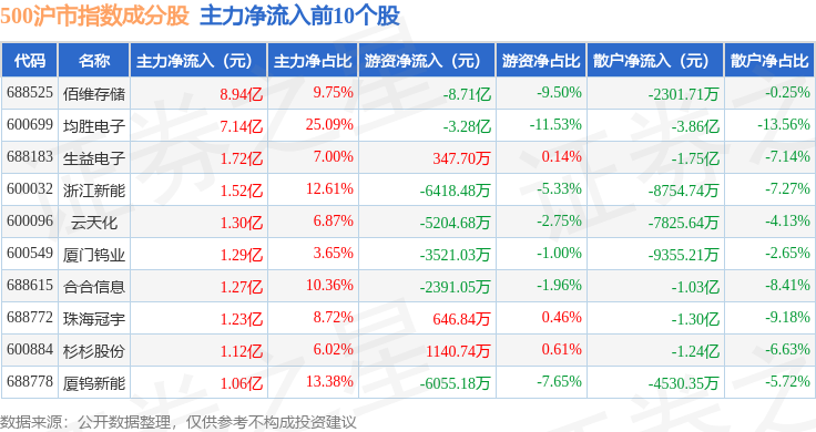 资金流向方面,500沪市(000802)指数成份股当日主力资金净流出合计32.0亿元,游资资金净流入合计6.96亿元,散户资金净流入合计25.04亿元。成份股资金流向详情见下表: