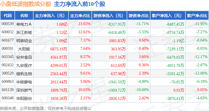 资金流向方面,小盘低波(399408)指数成份股当日主力资金净流出合计8.63亿元,游资资金净流入合计1.75亿元,散户资金净流入合计6.88亿元。成份股资金流向详情见下表: