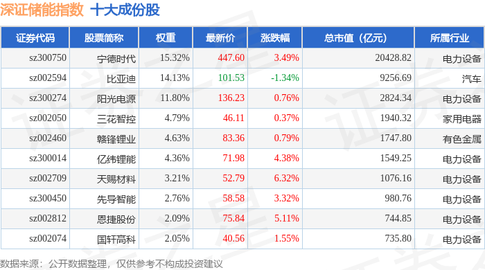 深证储能(970036)指数十大成份股详情如下: