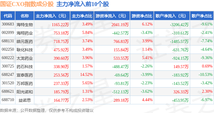 资金流向方面,国证CXO(980120)指数成份股当日主力资金净流出合计9.31亿元,游资资金净流入合计2.86亿元,散户资金净流入合计6.45亿元。成份股资金流向详情见下表: