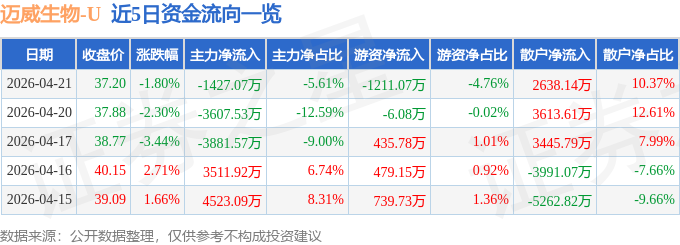 证券之星消息,截至2026年4月21日收盘,迈威生物(688062)报收于37.2元,下跌1.8%,换手率3.34%,成交量6.83万手,成交额2.54亿元。