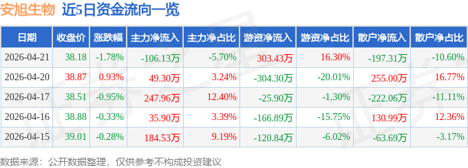 证券之星消息,截至2026年4月21日收盘,安旭生物(688075)报收于38.18元,下跌1.78%,换手率0.38%,成交量4855.0手,成交额1861.98万元。