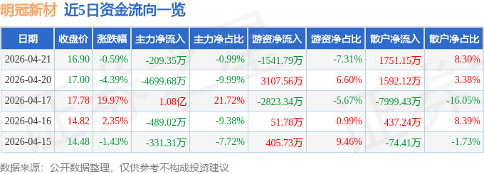 证券之星消息,截至2026年4月21日收盘,明冠新材(688560)报收于16.9元,下跌0.59%,换手率6.23%,成交量12.54万手,成交额2.11亿元。
