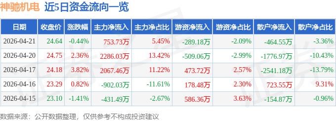 证券之星消息,截至2026年4月21日收盘,神驰机电(603109)报收于24.64元,下跌0.44%,换手率2.67%,成交量5.58万手,成交额1.38亿元。