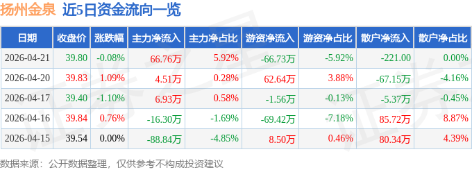 证券之星消息,截至2026年4月21日收盘,扬州金泉(603307)报收于39.8元,下跌0.08%,换手率0.42%,成交量2840.0手,成交额1127.64万元。