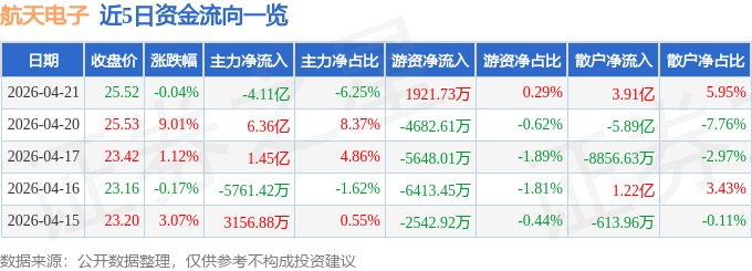 证券之星消息,截至2026年4月21日收盘,航天电子(600879)报收于25.52元,下跌0.04%,换手率7.83%,成交量258.22万手,成交额65.72亿元。