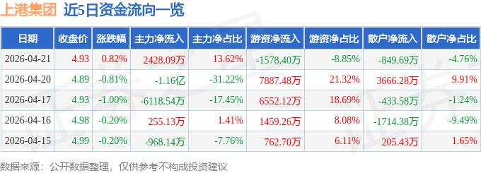 证券之星消息,截至2026年4月21日收盘,上港集团(600018)报收于4.93元,上涨0.82%,换手率0.16%,成交量36.24万手,成交额1.78亿元。