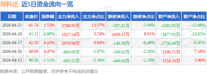 证券之星消息,截至2026年4月21日收盘,深科达(688328)报收于41.74元,上涨1.53%,换手率7.18%,成交量6.78万手,成交额2.81亿元。