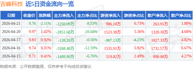 证券之星消息,截至2026年4月21日收盘,吉峰科技(300022)报收于9.76元,下跌2.11%,换手率3.04%,成交量15.01万手,成交额1.47亿元。