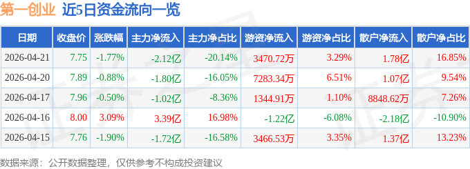 证券之星消息,截至2026年4月21日收盘,第一创业(002797)报收于7.75元,下跌1.77%,换手率3.24%,成交量135.97万手,成交额10.54亿元。