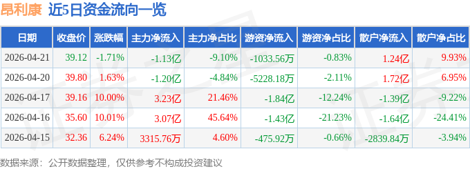 证券之星消息,截至2026年4月21日收盘,昂利康(002940)报收于39.12元,下跌1.71%,换手率17.16%,成交量31.79万手,成交额12.45亿元。