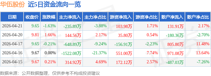 证券之星消息,截至2026年4月21日收盘,华伍股份(300095)报收于9.65元,下跌1.63%,换手率1.84%,成交量6.31万手,成交额6080.06万元。