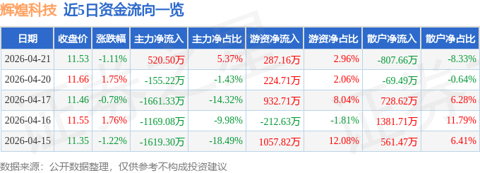 证券之星消息,截至2026年4月21日收盘,辉煌科技(002296)报收于11.53元,下跌1.11%,换手率2.43%,成交量8.44万手,成交额9697.99万元。