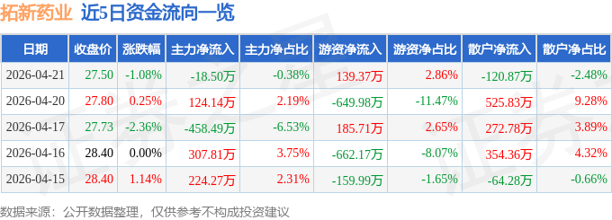 证券之星消息,截至2026年4月21日收盘,拓新药业(301089)报收于27.5元,下跌1.08%,换手率1.95%,成交量1.77万手,成交额4867.5万元。