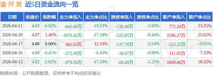 证券之星消息,截至2026年4月21日收盘,渝 开 发(000514)报收于4.83元,下跌0.82%,换手率0.81%,成交量6.86万手,成交额3321.09万元。